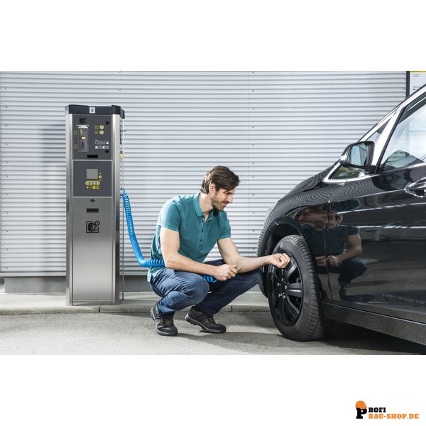Der Kärcher Reifenfüller AT-C wurde entwickelt, um die Attraktivität Ihres Standortes zu steigern und gleichzeitig Mehrumsätze zu generieren. Er bietet Ihren Kunden einen wertvollen Zusatzservice zur präzisen Überprüfung und Befüllung von Reifen bis zu einem Druck von 8 bar, und das ganz ohne hohe Investitionskosten Ihrerseits. Das Gerät ist mit einem elektronischen Münzprüfer ausgestattet, der flexibel unterschiedliche Münz- oder Wertmarkentypen akzeptiert. Die Laufzeit kann individuell und stufenlos auf bis zu 7 Minuten eingestellt werden, um optimal auf lokale Gegebenheiten einzugehen.