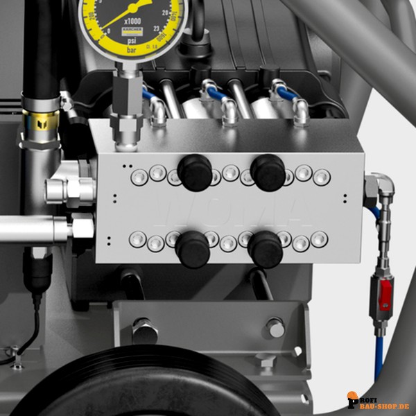 • Leistungsstarke Industrie-Hochdruckpumpe: Ausgestattet mit Hartmetall-Plungern für eine herausragende Standzeit und eine Zentralventilbauweise für hohen volumetrischen Wirkungsgrad. Der servicefreundliche Aufbau ermöglicht einen einfachen Wechsel von Verschleißteilen.