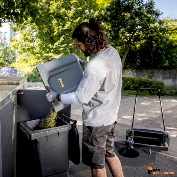 Die Kärcher KM 70/15 C Classic ist die ideale kompakte Handkehrmaschine, die sofort für das effiziente Kehren von kleinen bis mittelgroßen Flächen im Innen- und Außenbereich einsatzbereit ist. Sie reinigt Flächen ab 100 Quadratmetern deutlich effektiver und bequemer als ein herkömmlicher Besen. Dank ihres niedrigen Eigengewichts und des geringen Rollwiderstands lässt sie sich mühelos manövrieren und transportieren. Der zuverlässige Antrieb der Kehrwalze über das linke Rad gewährleistet einen konstanten Transport des Kehrguts in den großzügigen Behälter. Selbst Ränder und Ecken werden präzise mit dem einstellbaren Seitenbesen erfasst, der sich zudem zur Staubreduktion hochklappen lässt und werkzeuglos wechselbar ist, was den Wartungsaufwand minimiert.