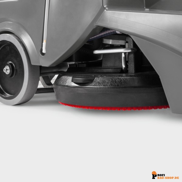Effiziente Scheibenbürstentechnik: Robuster, integrierter Scheibenbürstenkopf für hohe Flächenleistungen und leichten Bürstenwechsel per Pedalauswurf.