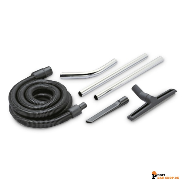 Das hochwertige Set besteht aus einem DN 40-Saugschlauch, einem robusten Stahlkrümmer, zwei 0,55 m langen Saugrohren sowie einer Bodendüse und einer Fugendüse, die alle in elektrisch leitender Ausführung gefertigt sind. Diese durchdachte Zusammenstellung ermöglicht eine vielseitige Nutzung und garantiert eine zuverlässige Performance bei der Entfernung von trockenem und nassem Schmutz.