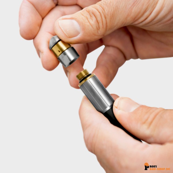 • Praktisches Wechselsystem mit 2 Düsen: Einfacher Wechsel zwischen Jet-Düse für starke Verstopfungen und rotierender Düse für präventive Unterhaltsreinigung mit 360°-Effekt.