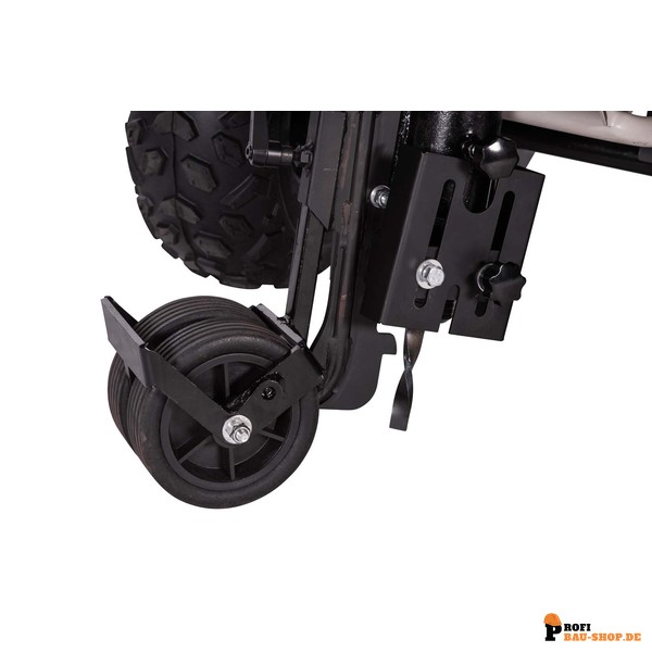 • Hohe Wendigkeit: 180° schwenkbares Führungsrad, bei Bedarf fixierbar, ermöglicht müheloses Arbeiten auch in verwinkelten Bereichen und unter Gebüsch.