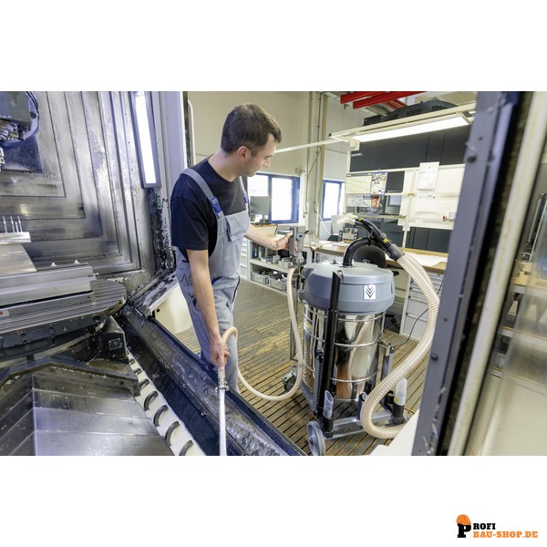 Der Kärcher IVR-L 100/24-2 Tc Me Dp ist eine hochleistungsfähige Lösung für industrielle Reinigungsaufgaben, die das Aufsaugen, Trennen und Rückführen von Flüssigkeiten mit Feststoffen wie Metallspänen erfordert. Mit seinem großzügigen 100-Liter-Behältervolumen und einer integrierten, autonomen Fasspumpe ist dieses kompakte Gerät speziell für den anspruchsvollen Dauereinsatz konzipiert. Sein hochwertiger Edelstahlbehälter erlaubt nicht nur die Verarbeitung großer Flüssigkeitsmengen und weitestgehend staubfreier Feststoffe, sondern macht ihn auch resistent gegenüber korrosiven Medien. Das ergonomische Kippfahrgestell, der 360° drehbare Schlauchanschluss und die transparente Füllstandsanzeige am Entleerschlauch unterstreichen die durchdachte Konstruktion, die Effizienz und Benutzerfreundlichkeit in den Vordergrund stellt. Die robuste Bauart mit ölfesten Rollen und Netzkabel garantiert eine lange Lebensdauer, selbst unter härtesten industriellen Bedingungen, und ermöglicht zudem eine Stapleraufnahme.