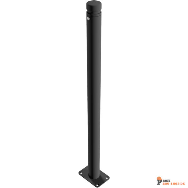 Absperr-Stilpfosten mit Ziernut aus Stahlrundrohr Ø 60 mm, ca. 950 mm überflur, feuerverzinkt und anthrazitgrau DB 703 beschichtet, ortsfest, für Dübelbefestigung mit Bodenplatte 100 x 150 mm, ohne Verschluss, ohne öse
