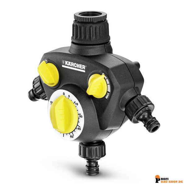 Die Kärcher Bewässerungsuhr WT 2 ist ein cleverer 3-Wege-Verteiler mit integrierter, automatischer Zeitschaltuhr (bis 120 min) für eine komfortable und effiziente Gartenbewässerung. Sie bietet zwei regulierbare Anschlüsse und ist robust sowie ergonomisch gestaltet.