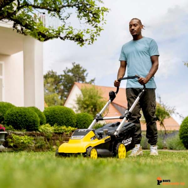 • Platzsparendes Design: Der Textilfangbehälter lässt sich auf ein Minimum zusammenfalten, und der klappbare Führungsholm ermöglicht eine äußerst platzsparende Aufbewahrung des Rasenmähers.