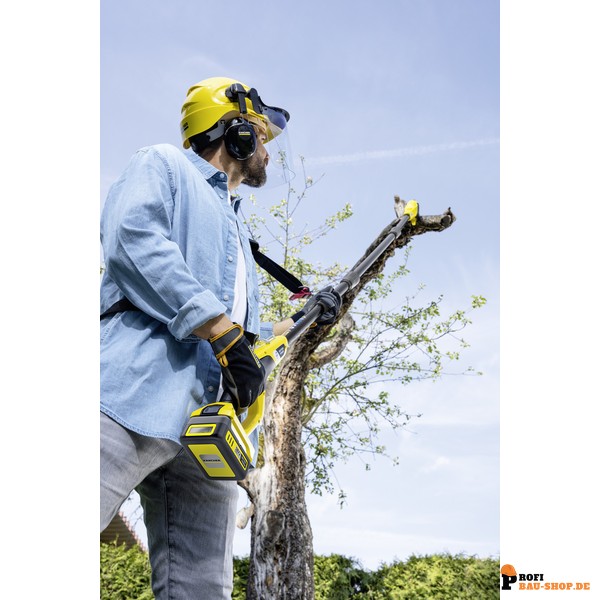 Die Kärcher Akku-Teleskopsäge PSW 18-20 Battery wurde speziell entwickelt, um die Baumpflege in großen Höhen sicherer und einfacher zu gestalten. Dank ihres praktischen Verlängerungseinsatzes erreichen Sie Äste in bis zu 4 Metern Höhe bequem vom Boden aus, wodurch gefährliche Kletterpartien der Vergangenheit angehören. Der optimierte 30°-Schwertwinkel ermöglicht einen komfortablen und präzisen Schnitt, während die einfache Kettenspannung und die automatische Kettenschmierung eine mühelose Bedienung und einen geringen Wartungsaufwand gewährleisten. Mit dem mitgelieferten Schultergurt wird die Handhabung auch bei längeren Arbeiten angenehm und die Gewichtsverteilung optimiert, sodass Sie effizient und ermüdungsarm arbeiten können.