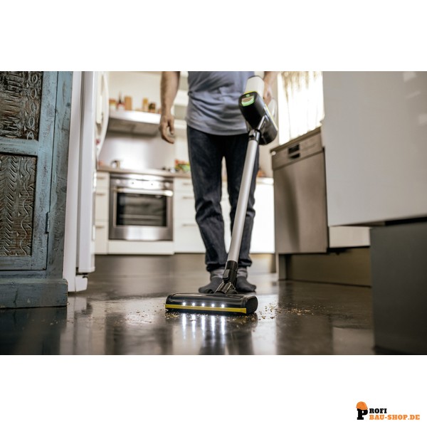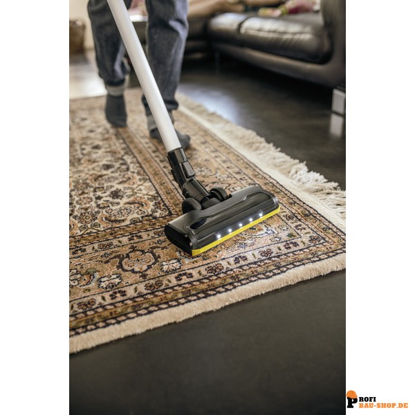 • Motorisierte Bodendüse mit LED-Licht: Reinigt Hartböden und Teppiche optimal und macht Schmutz in dunklen Ecken und unter Möbeln sichtbar.