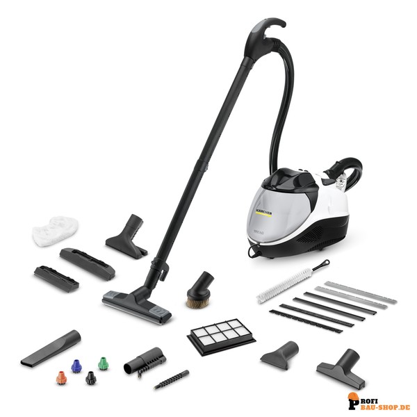 • Bodenreinigungsset mit Dampfsaugfunktion: 3 verschiedene Einsätze für Hart- und Teppichboden und 2 Dampfsaugrohre à 0,5 m