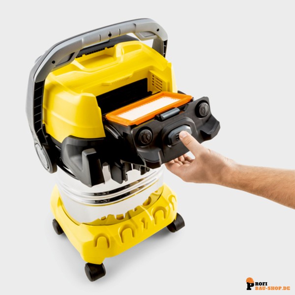• Patentierte Filterentnahmetechnik: Sekundenschneller und einfachster Ausbau des Filters durch Herausklappen der Filterkassette – ganz ohne Schmutzkontakt. Ideal für Nass- und Trockensaugen ohne Filterwechsel.