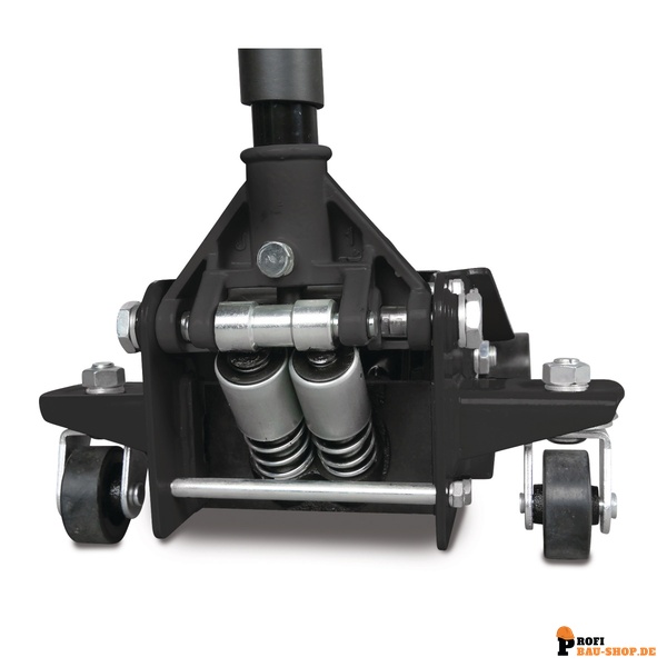 Ein herausragendes Merkmal dieses Rangierwagenhebers ist sein innovatives Doppelkolbensystem, das die Anzahl der benötigten Pumpvorgänge deutlich reduziert und somit ein schnelles Erreichen der maximalen Hubhöhe ermöglicht. Der zweiteilige Pumphebel mit Gummigriff liegt optimal in der Hand und erleichtert das präzise Positionieren und Anheben. Die Ventilsteuerung über den drehbaren Pumphebel gewährleistet ein sicheres und kontrolliertes Absenken der Last.