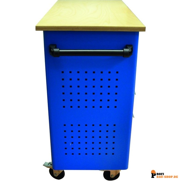 Dank der zwei Lenkrollen mit Feststeller und zwei Bockrollen ist der Werkstattwagen äußerst mobil und lässt sich mühelos an jeden Einsatzort bewegen. Ein seitliches Anbauteil mit höhenverstellbarem Fachboden erweitert die Ablagemöglichkeiten und sorgt für noch mehr Ordnung und Effizienz in Ihrer Werkstatt.