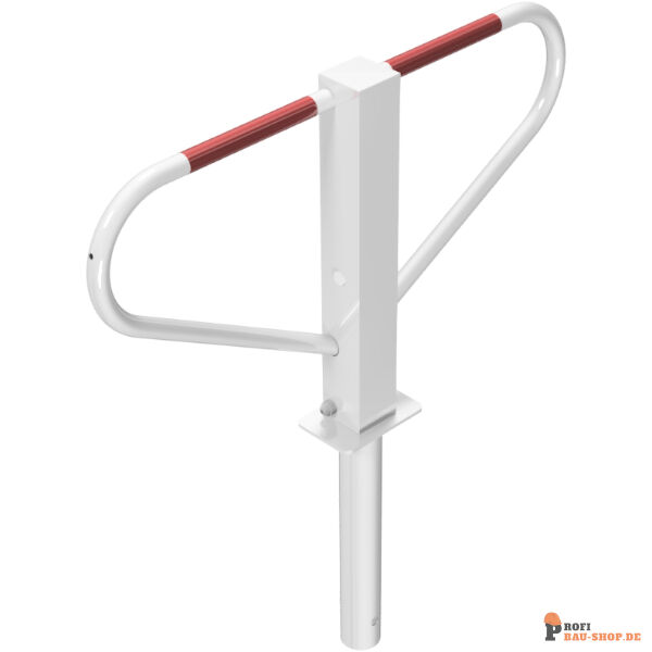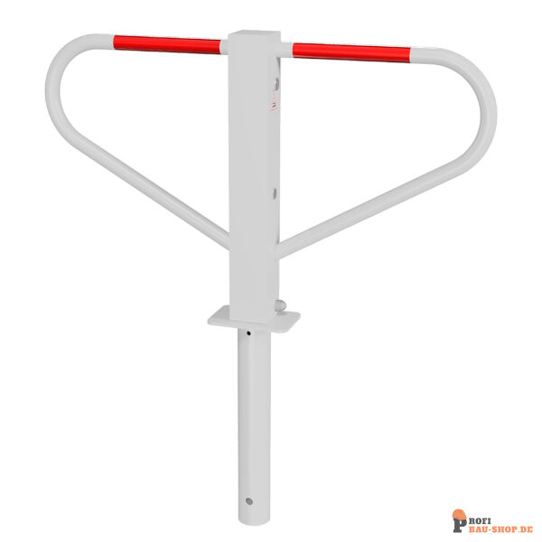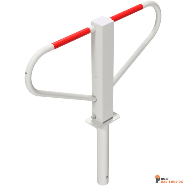 Parkplatzsperre, umlegbar, Vierkantrohr 70 x 70 mm, mit seitlichen Rundrohrbügeln, Gesamtbreite ca. 800 mm, überflur 500 mm, selbsteinrastende Verriegelung, umlegbar, mit Rundzylinder, drei Schlüssel, selbsteinrastende Verriegelung, zum Einbetonieren, mit angeschweißtem Bodenanker, ca. 400 mm Unterflur, feuerverzinkt, mit rot reflektierenden Leuchtstreifen