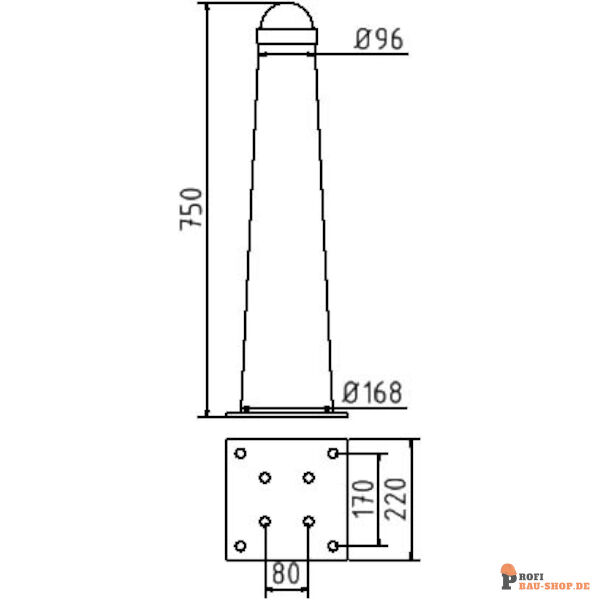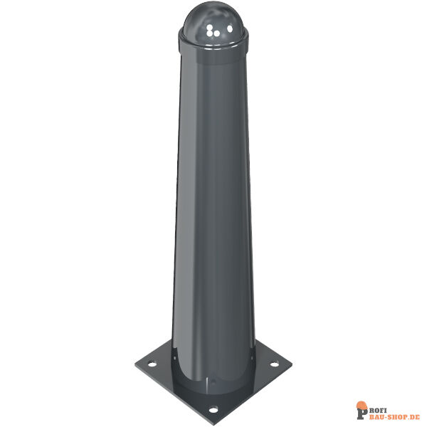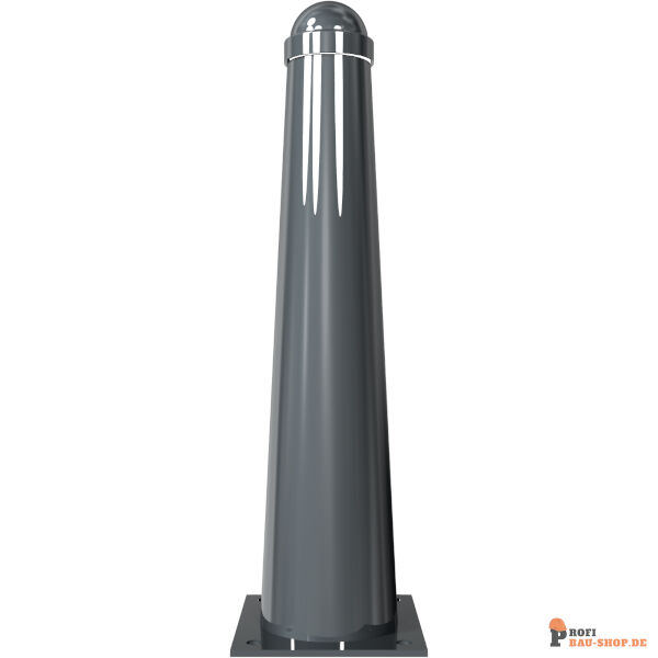 Stilpoller aus Stahlrohr Konisch Ø 168 / 96 mm, mit Zierkappe, ca. 750 mm überflur, feuerverzinkt und antikbraun (RAL 8019) beschichtet, ortsfest, für Dübelbefestigung mit Bodenplatte 220 x 220 mm, ohne öse