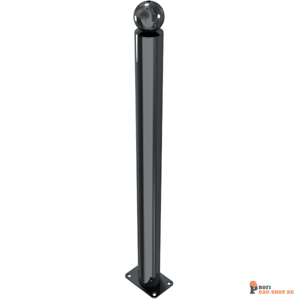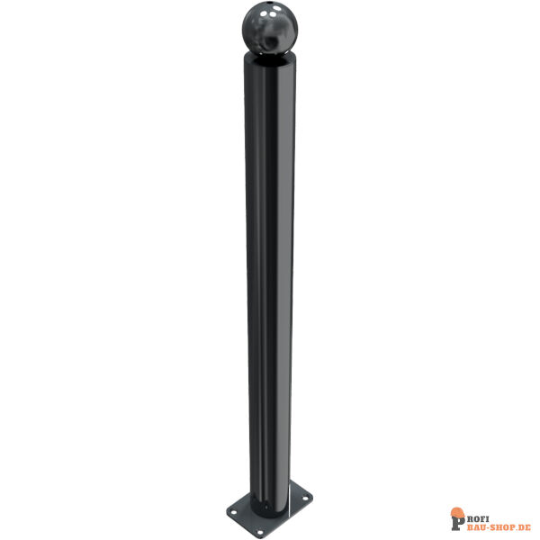 Absperr-Stilpfosten aus Stahlrohr Ø 76 mm, ca. 950 mm überflur, feuerverzinkt und anthrazitgrau (RAL 7016) beschichtet, ortsfest, für Dübelbefestigung; mit Bodenplatte 100 x 150 mm, ohne Verschluss, ohne öse