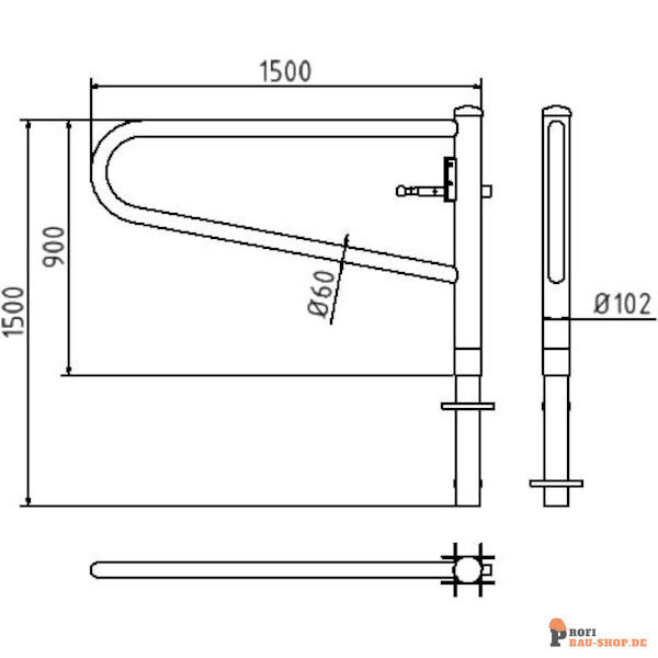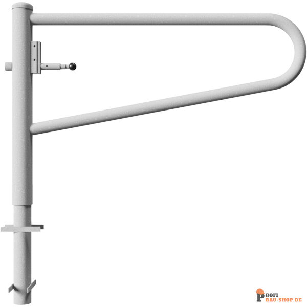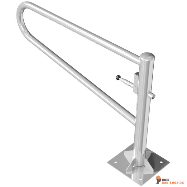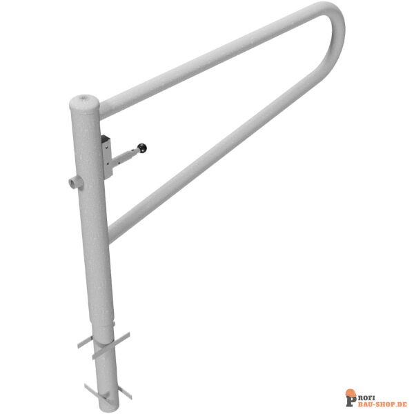 Drehbare Gatterschranke, horizontal schwenkbare Schranke ohne Auflagepfosten. Verriegelung geschlossen oder geöffnet mit Steckbolzen, vorgerichtet für Vorhangschloss oder Dreikantverschluss nach DIN 3223 bzw. Profilzylinderschloss. Drehpfosten: Stahlrohr Ø 102 mm, Schrankenbaum: Stahlrohr Ø 60 mm, Höhe: ca. 950 mm überflur, zum Einbetonieren, feuerverzinkt, Gesamtbreite: 1500 mm, für Vorhangschloss