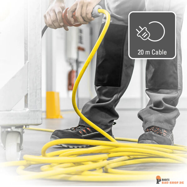 Dieses 20 Meter lange Verlängerungskabel aus deutscher Qualitätsfertigung mit Schutzart IP44 eignet sich ideal für den harten Einsatz auf Baustellen und im gewerblichen Bereich. Der widerstandsfähige Kabelmantel in gelber Sicherheitsfarbe besteht aus öl- und säurebeständigem Neopren-Kautschuk für einen Umgebungstemperaturbereich von -25 °C bis +60 °C.
