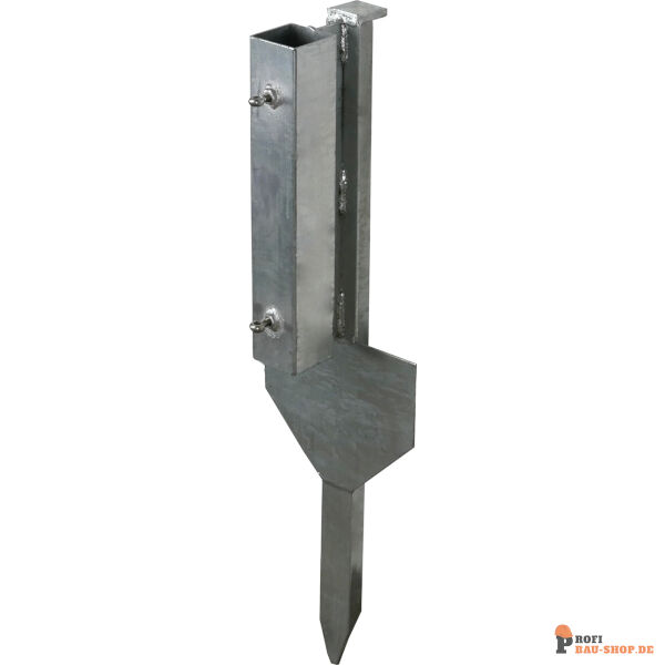 Erdspieß nach TL - Typ Standard 60, zum Einstecken von 60 x 60 mm und Ø 60 mm Schaftrohren, angespitztes T-Profil mit aufgeschweißtem Schlagblech zum Einschlagen ins Erdreich, ein Trapezblech sichert den Erdspieß gegen Torsion, 2 Stellschrauben fixieren das Schaftrohr im Aufnahmestutzen, Einschlagtiefe: 460 mm