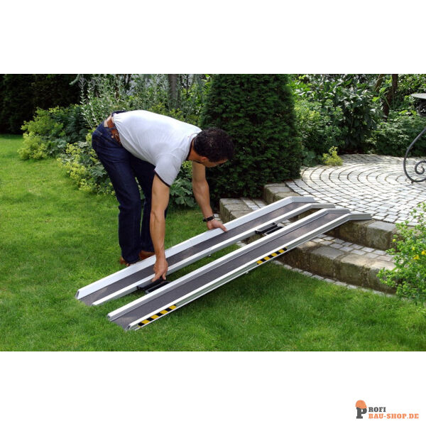 Die leichte Alu Schiene RAS von ALTEC, aus stabiler Aluminiumlegierung hergestellt, ist als Paar eine ideale, sichere Auffahrrampe für Rollstühle. Mit ihr lassen sich mehrere Stufen oder ganze Treppen leicht mit einem Rollstuhl befahren. Vor allem aber ist es mit dieser mobilen, rutschfesten Rollstuhlrampe kinderleicht, einen Rollstuhl auf die Ladefläche eines Autos und auch wieder herunter zu befördern. Stabile Tragegriffe sorgen dafür, dass die einzelnen Schienen leicht zu transportieren sind. Somit können sie auch ortsunabhängig eingesetzt werden. Lieferbar ist die RAS in Längen von 200, 250 und 300 cm. Mit dem stabilen Sicherheitsrand ist eine stabile Führung in der Fahrrinne garantiert. Das niedrige Gewicht von, je nach Länge, 8 bis 12 kg steht wieder in erstaunlichem Gegensatz zur Tragkraft von 360 bis 380 kp pro Paar. Mit den unterschiedlichen Schienenlängen sind bei 20 % Steigung Höhen Differenzen von 36,5 bis 56,5 cm möglich. Da sind höher gelegene Plattenabsätze, Podeste oder Stufen im Garten- oder Parkbereich mit dem Rollstuhl plötzlich auch befahrbar. ALTEC bietet eben Sicherheit, Qualität und Zweckmäßigkeit in einem.